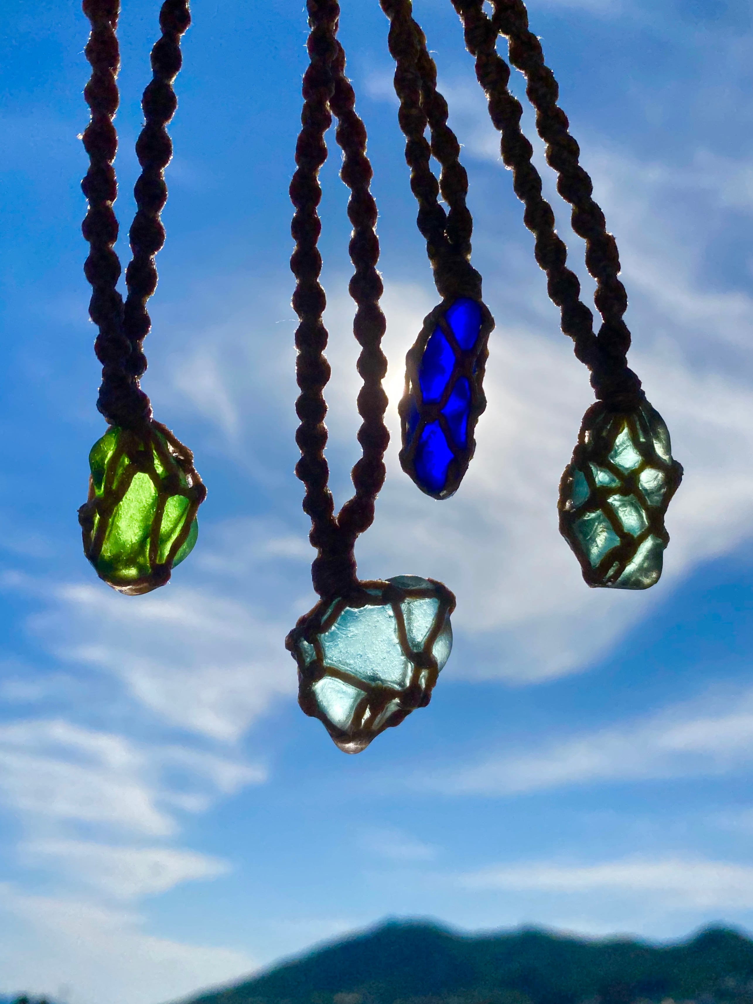 淡路島で採取したシーグラスをヘンプ紐で編み上げ、全行程"brother"YASSHIのハンドメイド作品。